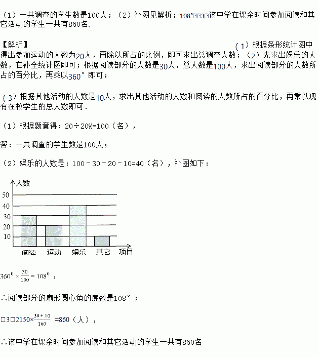 某中学现有在校学生2150人,为了解该校学生的课余活动情况,采取随机抽样的方法从阅读、运动、娱乐、其它四个方面调查了若干名学生,并将调查的结果绘制了如下两幅不完整的统计图,请你根据图中提供的信息解答下列问题: