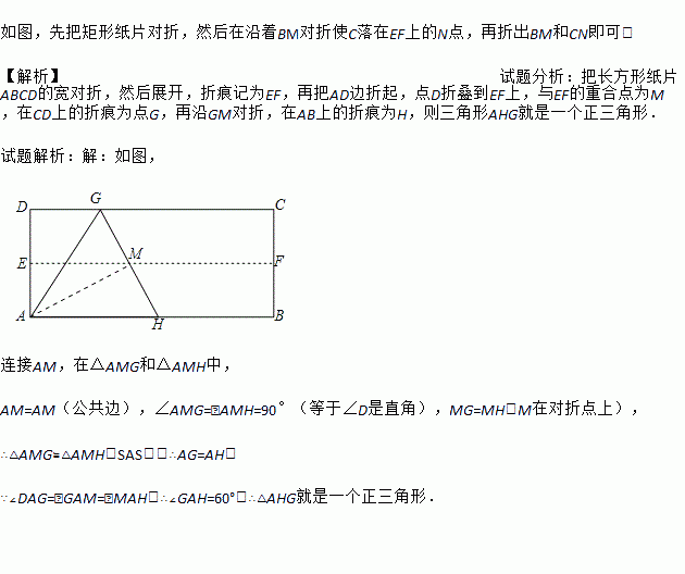 你能用一张长方形的纸片折出一个正三角形吗?动手试一试,简单叙述你的折法.