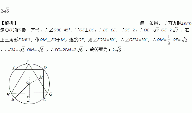 若圆内接正方形的边心距为2,则这个圆内接三角形的边长为______ .