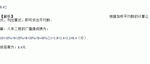 如果将服装统一、进退场有序、动作规范、动作整齐这四项得分一次按10%,20%,30%,40%的比例计算比赛成绩,那么八年级二班这次比赛的成绩为_______ .