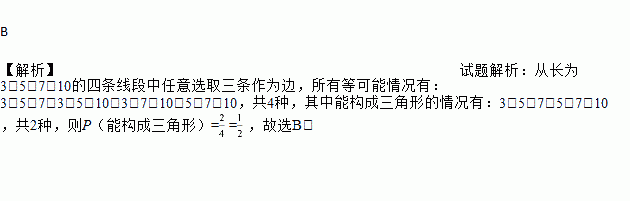 从长为3,5,7,10的四条线段中任意选取三条作为边,能构成三角形的概率是( )