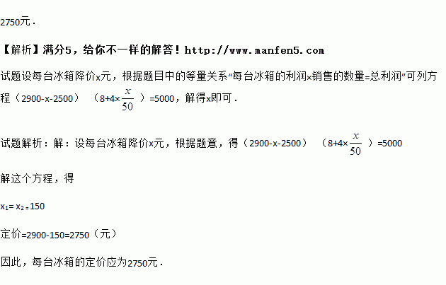 新华商场为迎接家电下乡活动销售某种冰箱,每台进价为2500元,市场调研表明;当销售价定为2900元时,平均每天能售出8台;而当销售价每降低50元时,平均每天就能多售出4台,商场要想使这种冰箱的销售利润平均每天达到5000元,每台冰箱的定价应为多少元?