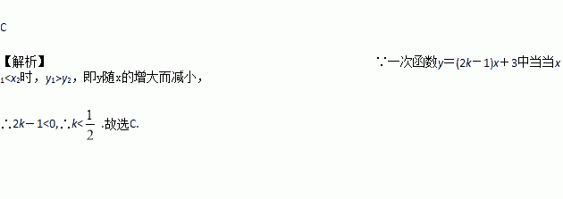 若一次函数y=(2k-1)x+3的图象经过A(x1,y1)和B(x2,y2)两点,且当x1<x2时,y1>y2,则k的取值范围是( )