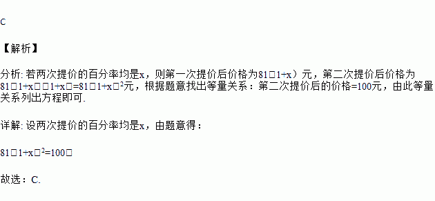 某药品经过两次调价,每瓶零售价由81元升为100元,已知两次提价的百分率都为x,那么x满足的方程是( )