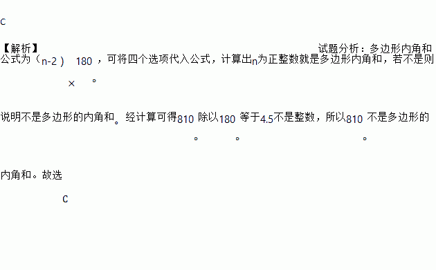 C 【解析】试题分析:多边形内角和公式为(n-2)×180°,可将四个选项代入公式,计算出n为正整数就是多边形内角和,若不是则说明不是多边形的内角和。经计算可得810°除以180°等于4.5不是整数,所以810°不是多边形的内角和。故选C