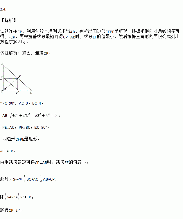 如图,Rt△ABC中,∠C=90°,AC=3,BC=4,点P为AB边上任一点,过P分别作PE⊥AC于E,PF⊥BC于F,则线段EF的最小值是__________.