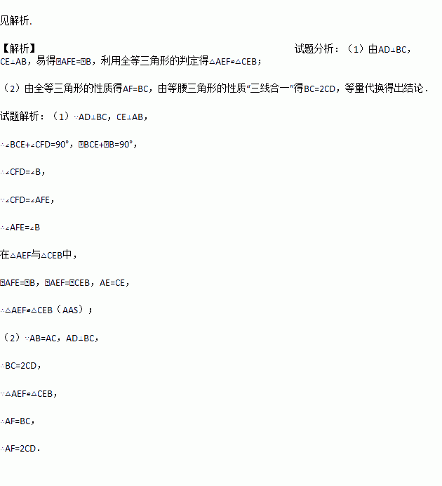 如图,△ABC中,AB=AC,AD⊥BC,CE⊥AB,AE=CE.求证:
