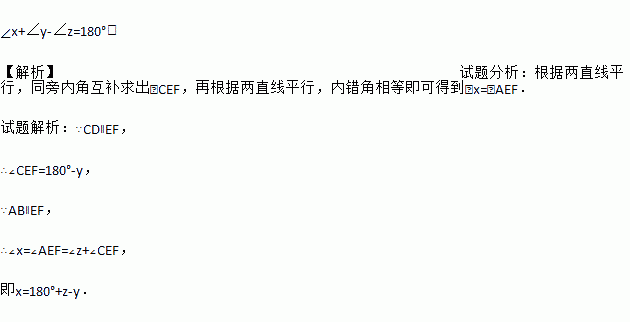 如图所示,已知AB∥CD∥EF, 则∠、∠、∠三者之间的关系是 .
