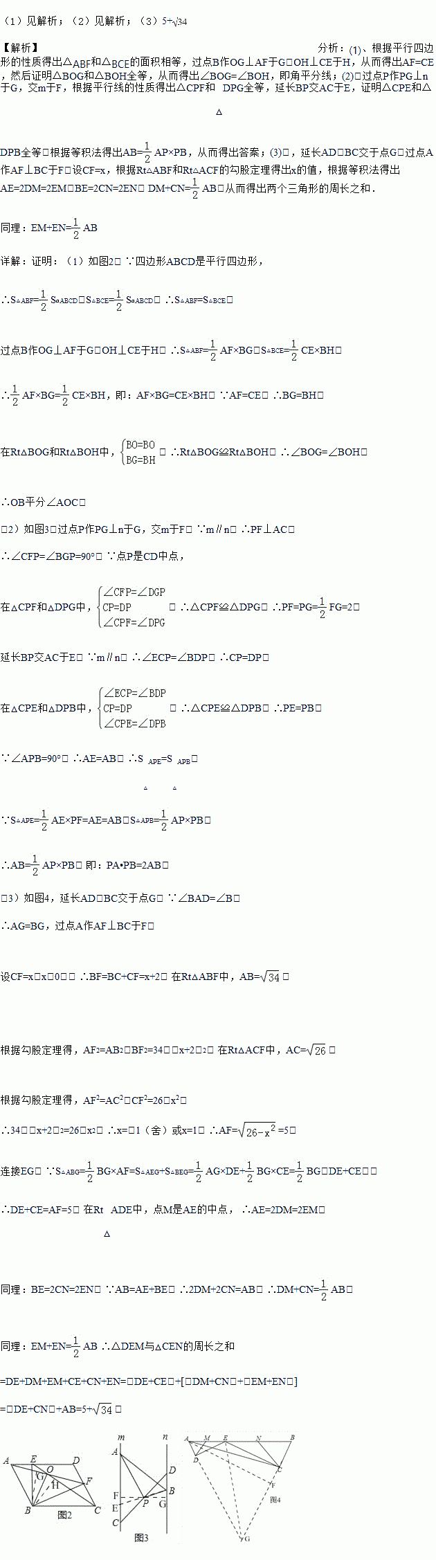 如图3,已知直线m∥n,点A、C是直线m上两点,点B、D是直线n上两点,点P是线段CD中点,且∠APB=90°,两平行线m、n间的距离为4.求证:PA•PB=2AB.