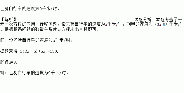 乙骑自行车的速度为9千米/时. 【解析】试题分析:本题考查了一元一次方程的应用---行程问题,设乙骑自行车的速度为x千米/时,则甲的速度为(3x-6)千米/时,根据相遇问题的数量关系建立方程求出其解即可. 【解析】 设乙骑自行车的速度为x千米/时, 据题意得 5(3x-6)+5x =150. 解得x=9. 答:乙骑自行车的速度为9千米/时.