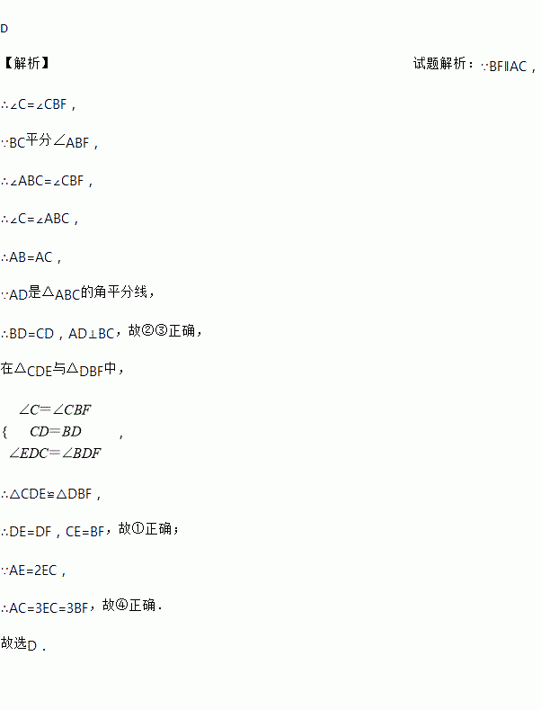 D 【解析】试题解析:∵BF∥AC, ∴∠C=∠CBF, ∵BC平分∠ABF, ∴∠ABC=∠CBF, ∴∠C=∠ABC, ∴AB=AC, ∵AD是△ABC的角平分线, ∴BD=CD,AD⊥BC,故②③正确, 在△CDE与△DBF中, , ∴△CDE≌△DBF, ∴DE=DF,CE=BF,故①正确; ∵AE=2EC, ...