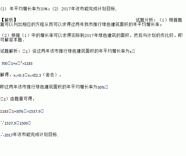 (1) ÄêÆ½¾ùÔö³¤ÂÊΪ30%£»(2) 2017Äê¸ÃÊÐÄÜÍê³É¼Æ»®Ä¿±ê. ¡¾½âÎö¡¿ÊÔÌâ·ÖÎö£º£¨1£©¸ù¾ÝÌâÒâ¿ÉÒÔÁгöÏàÓ¦µÄ·½³Ì´Ó¶ø¿ÉÒÔÇóµÃÕâÁ½ÄêÎÒÊÐÍÆÐÐÂÌÉ«½¨ÖþÃæ»ýµÄÄêÆ½¾ùÔö³¤ÂÊ£» £¨2£©¸ù¾Ý£¨1£©ÖеÄÔö³¤ÂÊ¿ÉÒÔÇóµÃʵ¼Êµ½2017ÄêÂÌÉ«½¨ÖþµÄÃæ»ý£¬È»ºóÓë¼Æ»®µÄ×÷±È½Ï£¬¼´¿É½â´ð±¾Ì⣮ ÊÔÌâ½âÎö£º£¨1£©ÉèÕâÁ½Äê¸ÃÊÐÍÆÐÐÂÌÉ«½¨ÖþÃæ»ýµÄÄêÆ½¾ùÔö³¤ÂÊΪx£¬ 700£¨1+x£©2=1183 ...