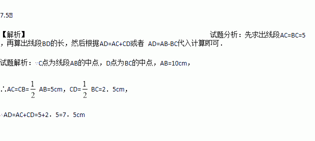 查看答案如图,已知C点为线段AB的中点,D点为BC的中点,AB=10cm,求AD的长度.