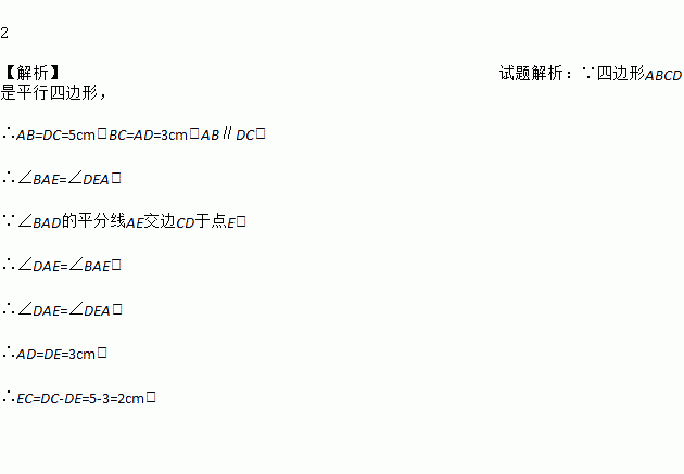 如图,在□ABCD中,∠BAD的平分线AE交边CD于点E,AB=5cm,BC=3cm,则EC=____cm.