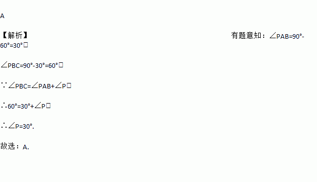 A 【解析】有题意知:∠PAB=90°-60°=30°, ∠PBC=90°-30°=60°, ∵∠PBC=∠PAB+∠P, ∴60°=30°+∠P, ∴∠P=30°. 故选:A.
