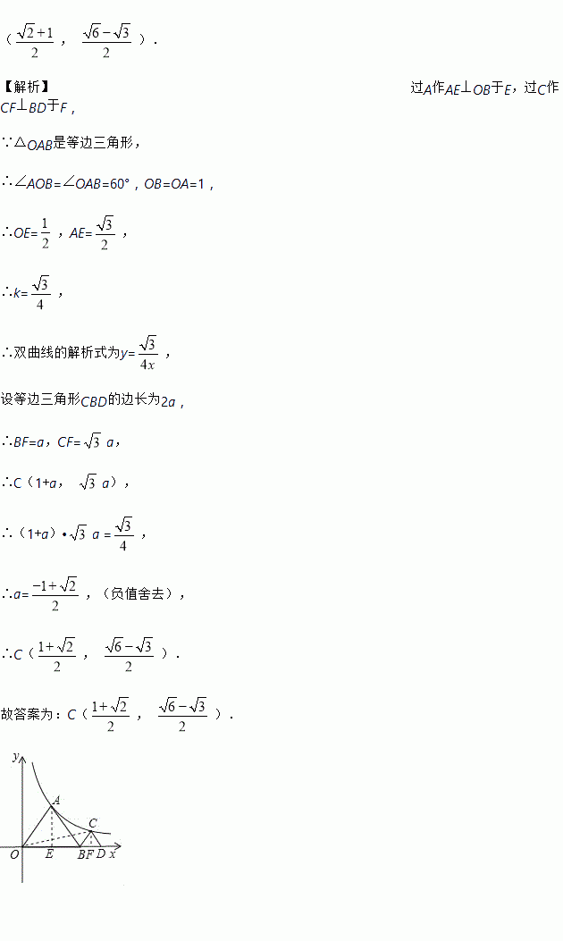 如图,等边△OAB和等边△BCD的顶点A、C分别在双曲线的图象上,若OA=1,则点C的坐标为____________.