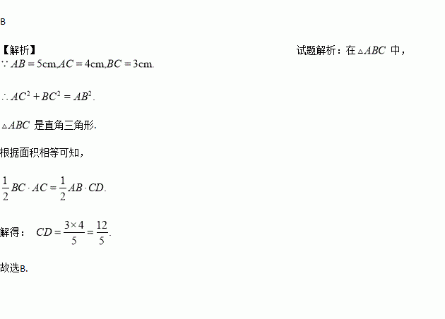 如图:Rt△ABC中,∠ACB=90°,CD是高,AC=4cm,BC=3cm,则CD=( )