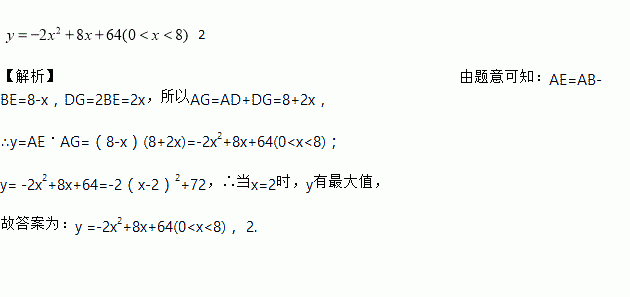 在北京市治理违建的过程中,某小区拆除了自建房,改建绿地. 如图,自建房占地是边长为8m的正方形ABCD,改建的绿地是矩形AEFG,其中点E在AB上,点G在AD的延长线上,且DG = 2BE. 如果设BE的长为x(单位:m),绿地AEFG的面积为y(单位:m2),那么y与x的函数的表达式为__________________;当BE =______m时,绿地AEFG的面积最大.