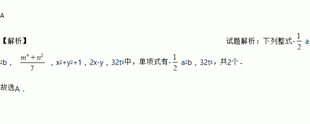 A 【解析】试题解析:下列整式-a2b, ,x2+y2+1,2x-y,32t3中,单项式有-a2b,32t3,共2个. 故选A.