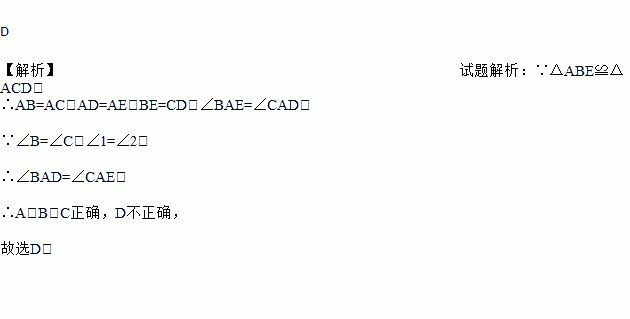 D 【解析】试题解析:∵△ABE≌△ACD, ∴AB=AC,AD=AE,BE=CD,∠BAE=∠CAD, ∵∠B=∠C,∠1=∠2, ∴∠BAD=∠CAE, ∴A、B、C正确,D不正确, 故选D.