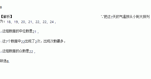 某市三月连续七天的日最高气温分别为21、18、22、24、22、20、19(单位:oC),这组数据的中位数、众数分别是()