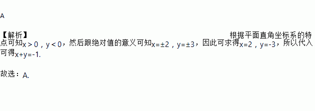 A 【解析】根据平面直角坐标系的特点可知x>0,y<0,然后跟绝对值的意义可知x=±2,y=±3,因此可求得x=2,y=-3,所以代入可得x+y=-1. 故选:A.