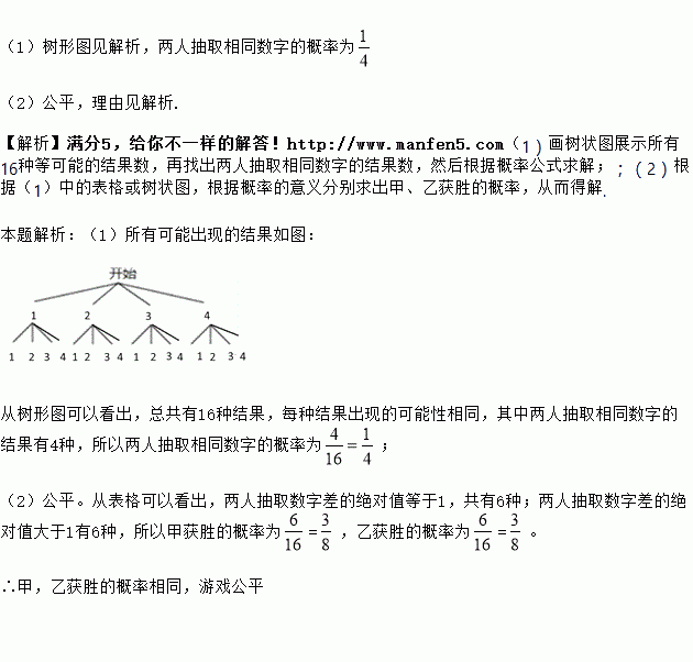 (2)若两人抽取的数字差的绝对值等于1,则甲获胜;若抽取的数字差的绝对值大于1,则乙获胜。这个游戏公平吗?请用概率的知识加以解释。