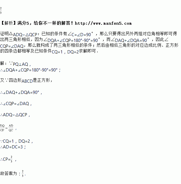 如图,Q为正方形ABCD的CD边上一点,CQ=1,DQ=2,P为BC上一点,若PQ⊥AQ,则CP=_____.