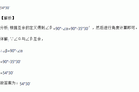 已知∠α与∠β互余,且∠α=35°30′,则∠β=_____.