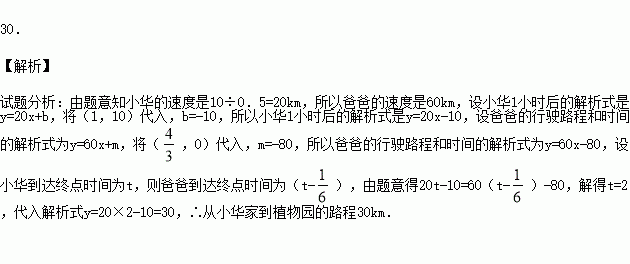 周末,小华骑自行车从家出发到植物园游玩,从家出发0.5小时后,因自行车损坏修理了一段时间后,按原速前往植物园,小华离家1小时20分后,爸爸开车沿相同路线前往植物园.如图是他们离家的路程y(km)y与小华离家的时间x(h)的函数图象,已知爸爸开车的速度是小华骑车速度的3倍.若爸爸比小华早10分达到植物园,则从小华家到植物园的路程是_________km.