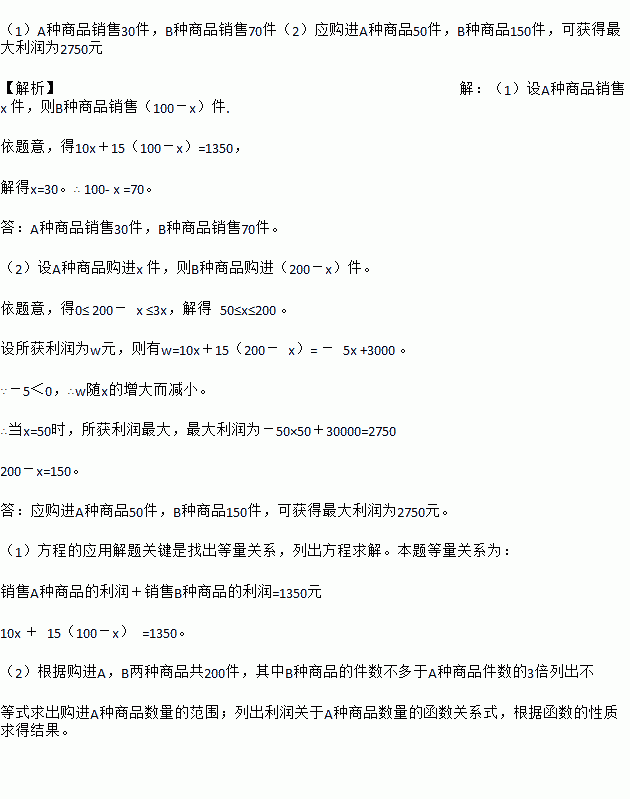 (1)该商店销售A,B两种商品共100件,获利润1350元,则A,B两种商品各销售多少件?(5分)