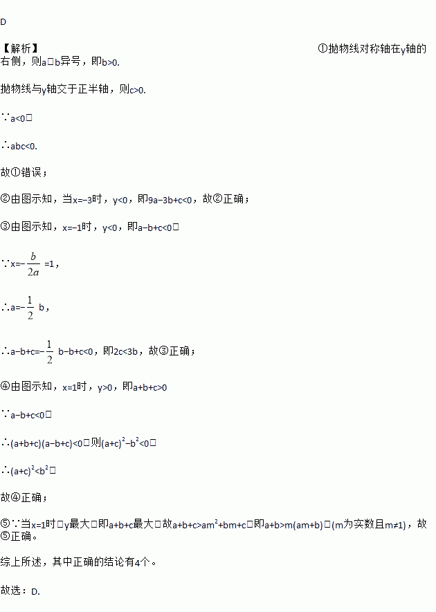 D 【解析】①抛物线对称轴在y轴的右侧,则a、b异号,即b>0. 抛物线与y轴交于正半轴,则c>0. ∵a<0, ∴abc<0. 故①错误; ②由图示知,当x=?3时,y<0,即9a?3b+c<0,故②正确; ③由图示知,x=?1时,y<0,即a?b+c<0, ∵x=?=1, ∴a=?b, ∴a?b+c=?b?b+c<0,即2c<3b,故...