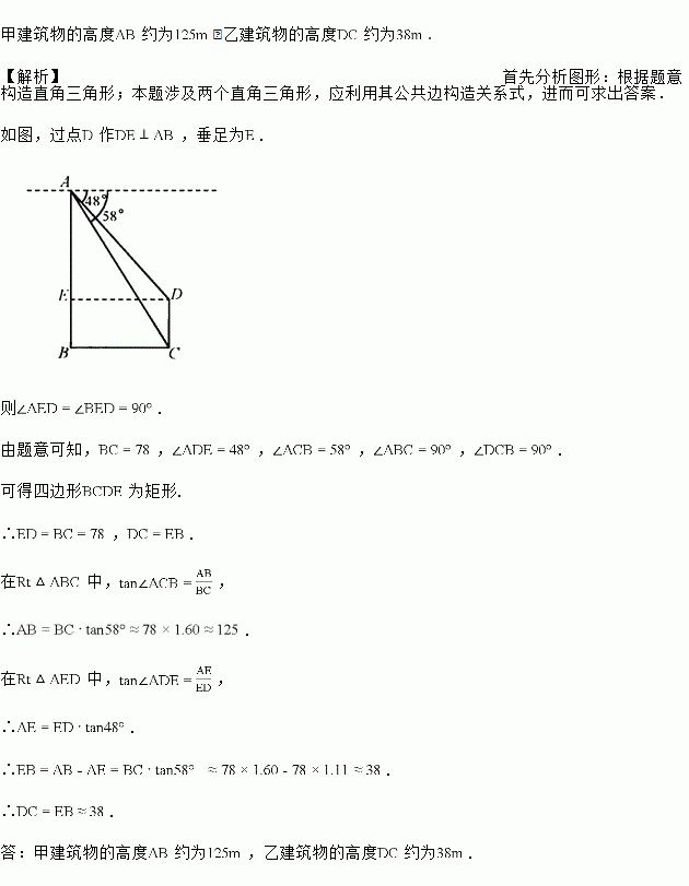 如图,甲、乙两座建筑物的水平距离为,从甲的顶部处测得乙的顶部处的俯角为,测得底部处的俯角为,求甲、乙建筑物的高度和(结果取整数).参考数据:,.