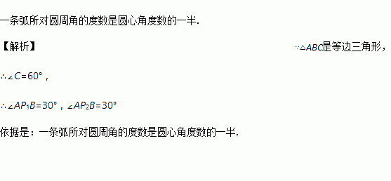 如图,直线L1与L2相交于点O,A,B是L2上两点,点P是直线L1上的点,且∠APB=30°,请在图中作出符合条件的点P.