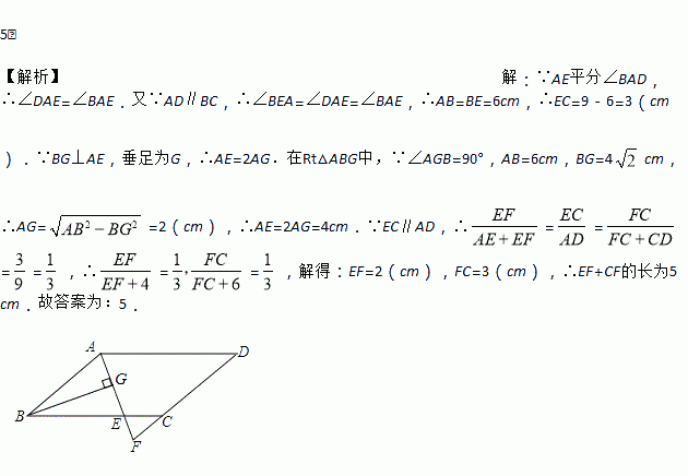 如图,在?ABCD中,AB=6cm,AD=9cm,∠BAD的平分线交BC于点E,交DC的延长线于点F,BG⊥AE,垂足为G,BG=4cm,则EF+CF的长为______cm.