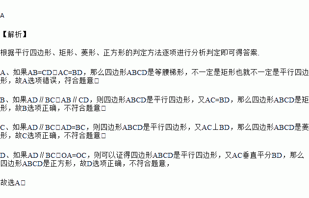 D. 如果OA=OC,AC⊥BD,那么四边形ABCD是菱形