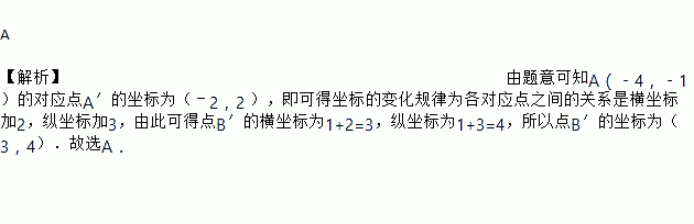 A 【解析】由题意可知A(﹣4,﹣1)的对应点A′的坐标为(﹣2,2 ),即可得坐标的变化规律为各对应点之间的关系是横坐标加2,纵坐标加3,由此可得点B′的横坐标为1+2=3,纵坐标为1+3=4,所以点B′的坐标为(3,4).故选A.