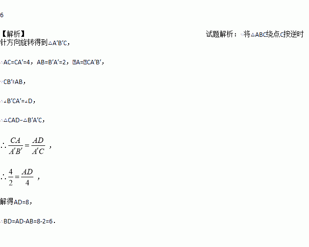 如图在△ABC中,AB=2,AC=4,将△ABC绕点C按逆时针方向旋转得到△A′B′C,使CB′∥AB,分别延长AB,CA′相交于点D,则线段BD的长为___________.