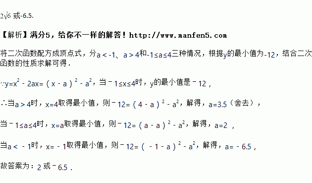 已知二次函数y=x2﹣2ax(a为常数).当﹣1≤x≤4时,y的最小值是﹣12,则a的值为_____