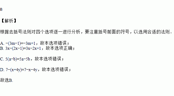 A. -(3m-1)=-3m-1 B. 3x-(2x-1)=3x-2x+1