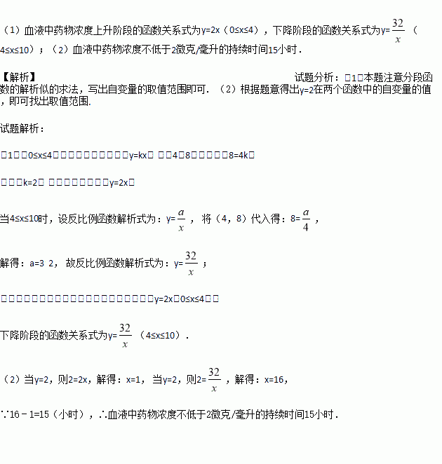药后血液中药物浓度y(微克/毫升)与服药时间x小时之间函数关系如图所示(当4≤x≤10时,y与x成反比例).