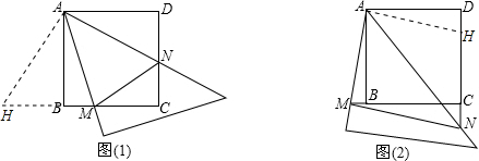 分析:(1)延长MB到H,使BH=DN,连结AH,先利用“SAS”可判断△ABH≌△ADN,则AH=AN,∠HAB=∠NAD,由于∠MAN=45°,则∠DAN+∠BAM=45°得到∠HAM=∠NAM,然后再根据“SAS”证明△AMH≌△AMN,则MH=MN,即HB+MB=MN,所以MN=BM+DN;