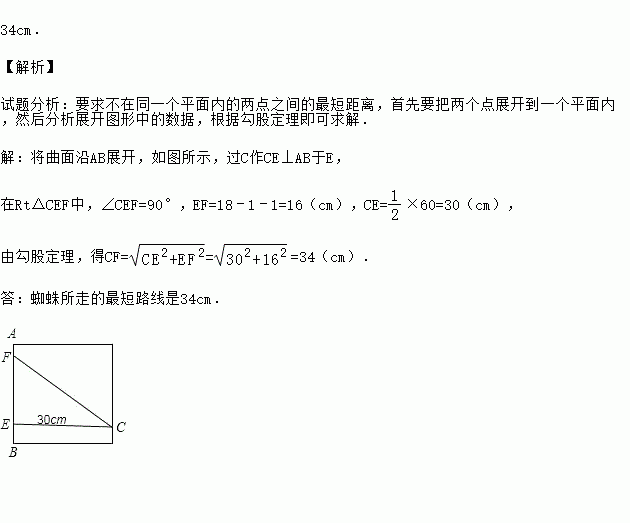如图,圆柱形无盖玻璃容器,高18cm,底面周长为60cm,在外侧距下底1cm的点C处有一蜘蛛,与蜘蛛相对的圆柱形容器的上口外侧距开口1cm的F处有一苍蝇,试求急于捕获苍蝇充饥的蜘蛛所走的最短路线的长度.