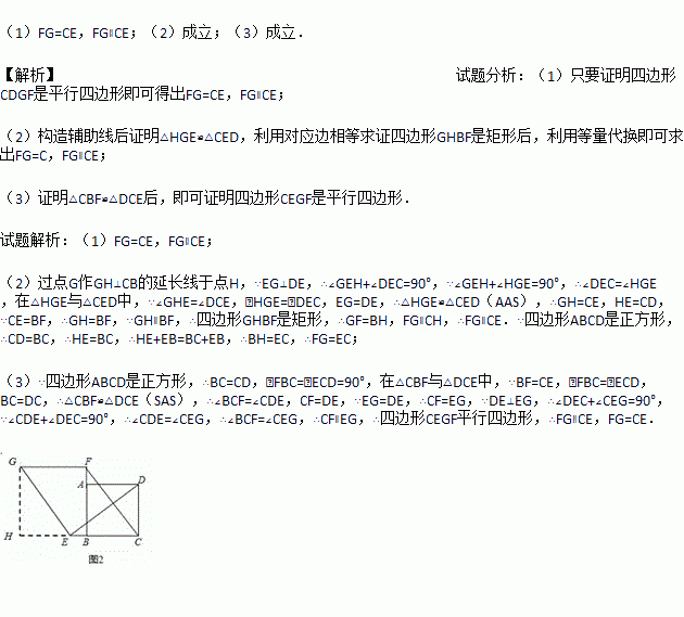 Èçͼ1£¬ÔÚÕý·½ÐÎABCDÖУ¬µãE¡¢F·Ö±ðÊDZßBC¡¢ABÉϵĵ㣬ÇÒCE=BF.Á¬½ÓDE£¬¹ýµãE×÷EG¡ÍDE£¬Ê¹EG=DE.Á¬½ÓFG£¬FC.
