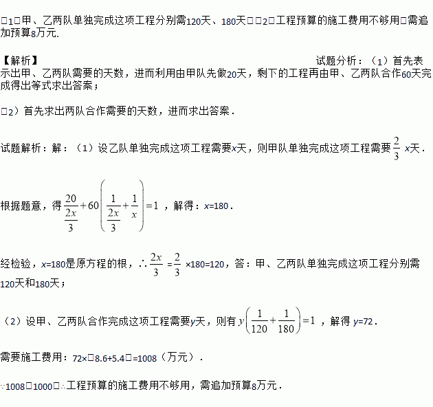 (1)甲、乙两队单独完成这项工程分别需120天、180天;(2)工程预算的施工费用不够用,需追加预算8万元. 【解析】试题分析:(1)首先表示出甲、乙两队需要的天数,进而利用由甲队先做20天,剩下的工程再由甲、乙两队合作60天完成得出等式求出答案; (2)首先求出两队合作需要的天数,进而求出答案. 试题解析:【解析】 (1)设乙队单独完成这项工程需要x天,则甲队单独完成这项工程...