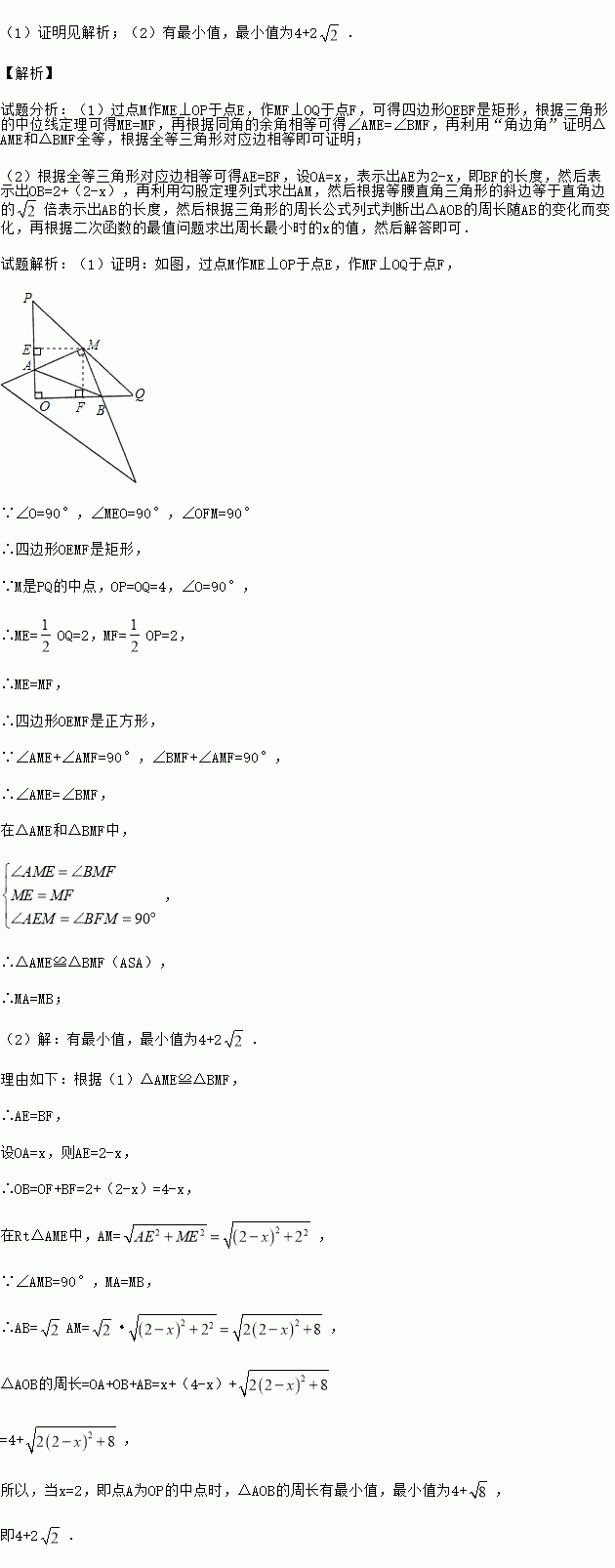 (1)证明见解析;(2)有最小值,最小值为4+2. 【解析】 试题分析:(1)过点M作ME⊥OP于点E,作MF⊥OQ于点F,可得四边形OEBF是矩形,根据三角形的中位线定理可得ME=MF,再根据同角的余角相等可得∠AME=∠BMF,再利用“角边角”证明△AME和△BMF全等,根据全等三角形对应边相等即可证明; (2)根据全等三角形对应边相等可得AE=BF,设OA=x,表示出AE为...