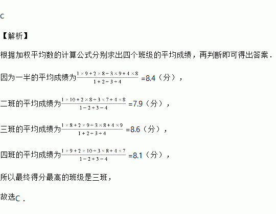 其中四个班级的成绩见如表,如果将各班这四项的得分依次按照1:2:3:4的权重来计算的话,最终得分最高的班级为![]()