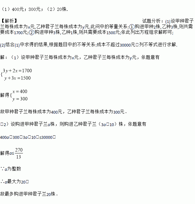 (2)该种植基地决定在成本不超过30000元的前提下购入甲、乙两种君子兰,若购入乙种君子兰的株数比甲种君子兰的3倍还多10株,求最多购进甲种君子兰多少株?