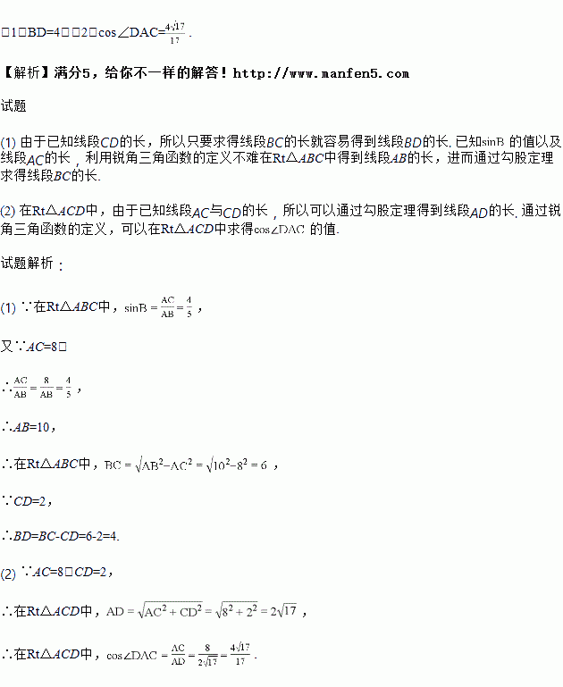 如图,在Rt△ABC中,已知∠C=90°,sinB=,AC=8,D为线段BC上一点,并且CD=2.