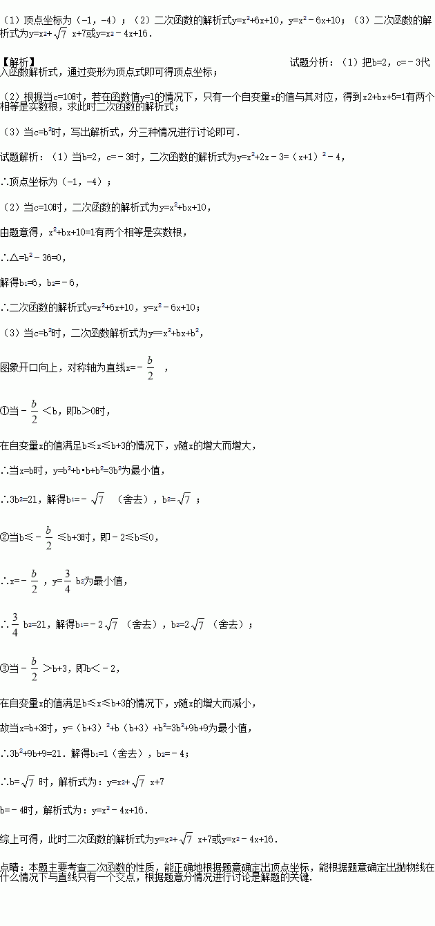 (3)当c=b2时,若在自变量x的值满足b≤x≤b+3的情况下,与其对应的函数值y的最小值为21,求此时二次函数的解析式.